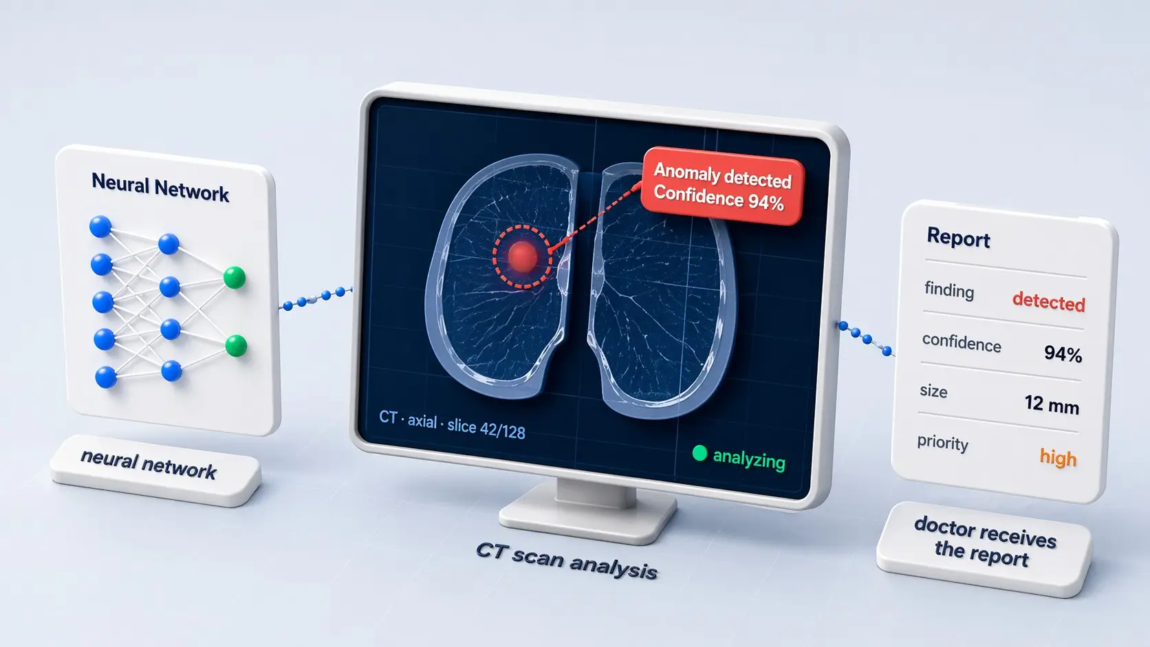 In practice, the workflow is straightforward. A physician uploads an image — such as a CT or MRI scan — into an AI system. The neural network analyzes it and highlights regions that may indicate abnormalities. It doesn’t replace the diagnosis but acts as a second set of eyes.